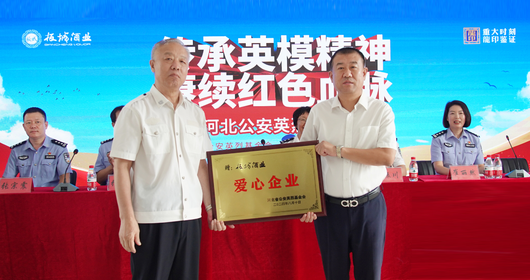 基于板城酒業(yè)積極踐行社會(huì)責(zé)任,舉辦或助力多項(xiàng)暖警公益活動(dòng),河北省公安英烈基金會(huì)理事長(zhǎng)吳鴻恩向板城酒業(yè)授牌,以感謝企業(yè)在警企共建等愛警公益事業(yè)上所做出的貢獻(xiàn)。