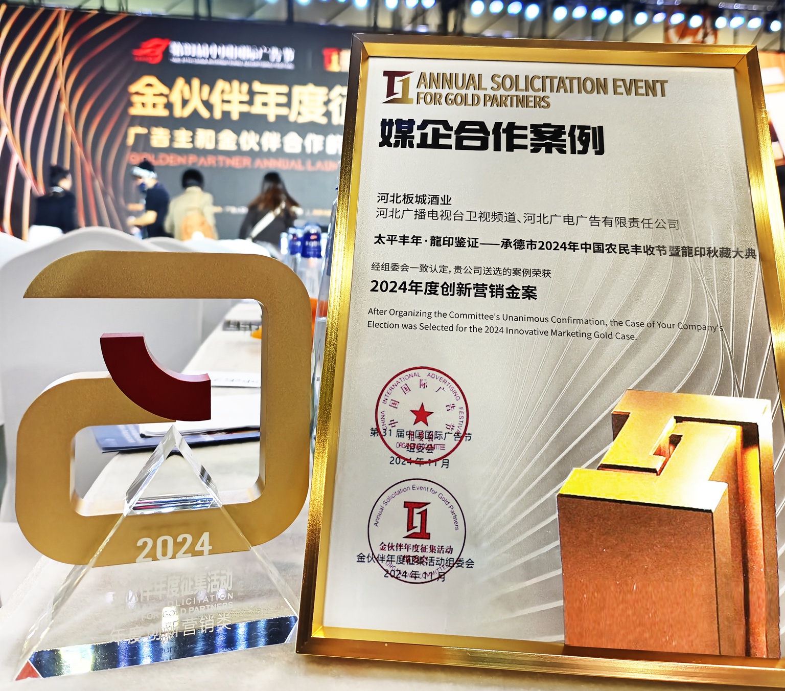 板城酒業(yè)與河北衛(wèi)視頻道合作案例【河北衛(wèi)視聯(lián)合廣電廣告助力板城酒業(yè)農(nóng)民豐收節(jié)暨龍印秋藏大典】入選31屆中國國際廣告節(jié)·2024廣告主金伙伴年度征集發(fā)布儀式·媒企合作案例·年度創(chuàng)新營銷金案。