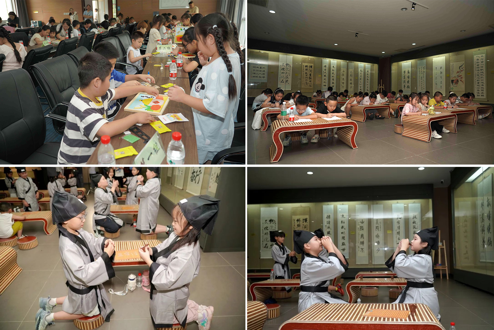 實(shí)踐點(diǎn)燃創(chuàng)造火花。在多媒體廳,孩子們巧手拼貼五谷雜糧,創(chuàng)作寓意深遠(yuǎn)的糧畫作品,于指尖再次感悟“粒粒皆辛苦”。字畫廳則化作文雅殿堂,孩子們?cè)趯?dǎo)師引領(lǐng)下,研習(xí)傳統(tǒng)酒禮中的賓主之道、長幼之序與君子之風(fēng),舉手投足間傳承著文明的儀軌。
