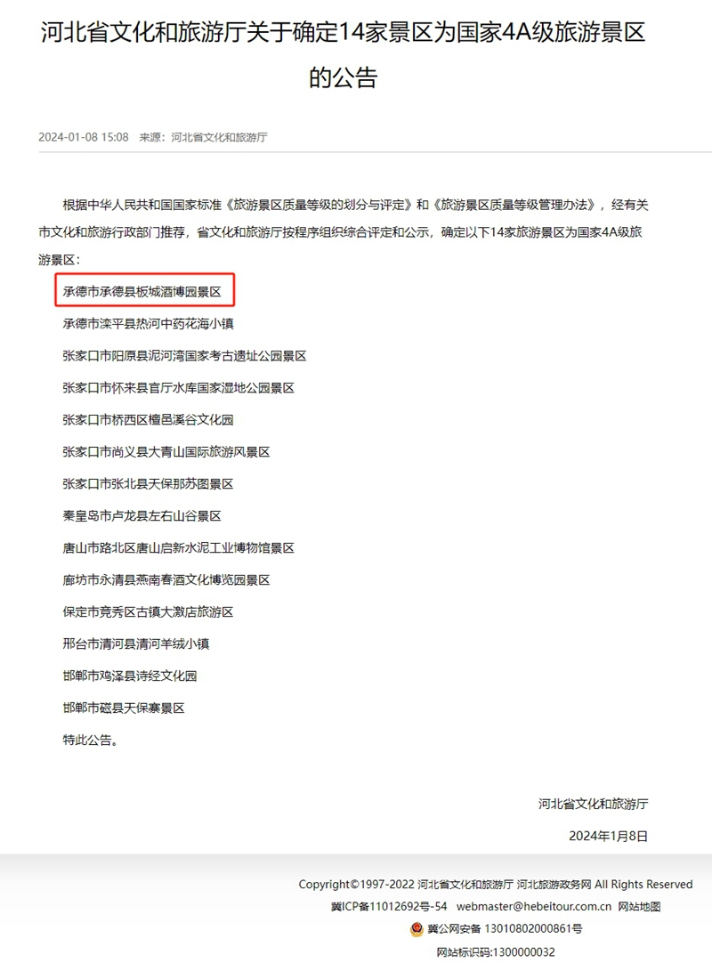 根據(jù)中華人民共和國國家標準《旅游景區(qū)質(zhì)量等級的劃分與評定》和《旅游景區(qū)質(zhì)量等級管理辦法》,經(jīng)有關(guān)市文化和旅游行政部門推薦,省文化和旅游廳按程序組織綜合評定,承德市承德縣板城酒博園景區(qū)被評選為國家4A級旅游景區(qū)。