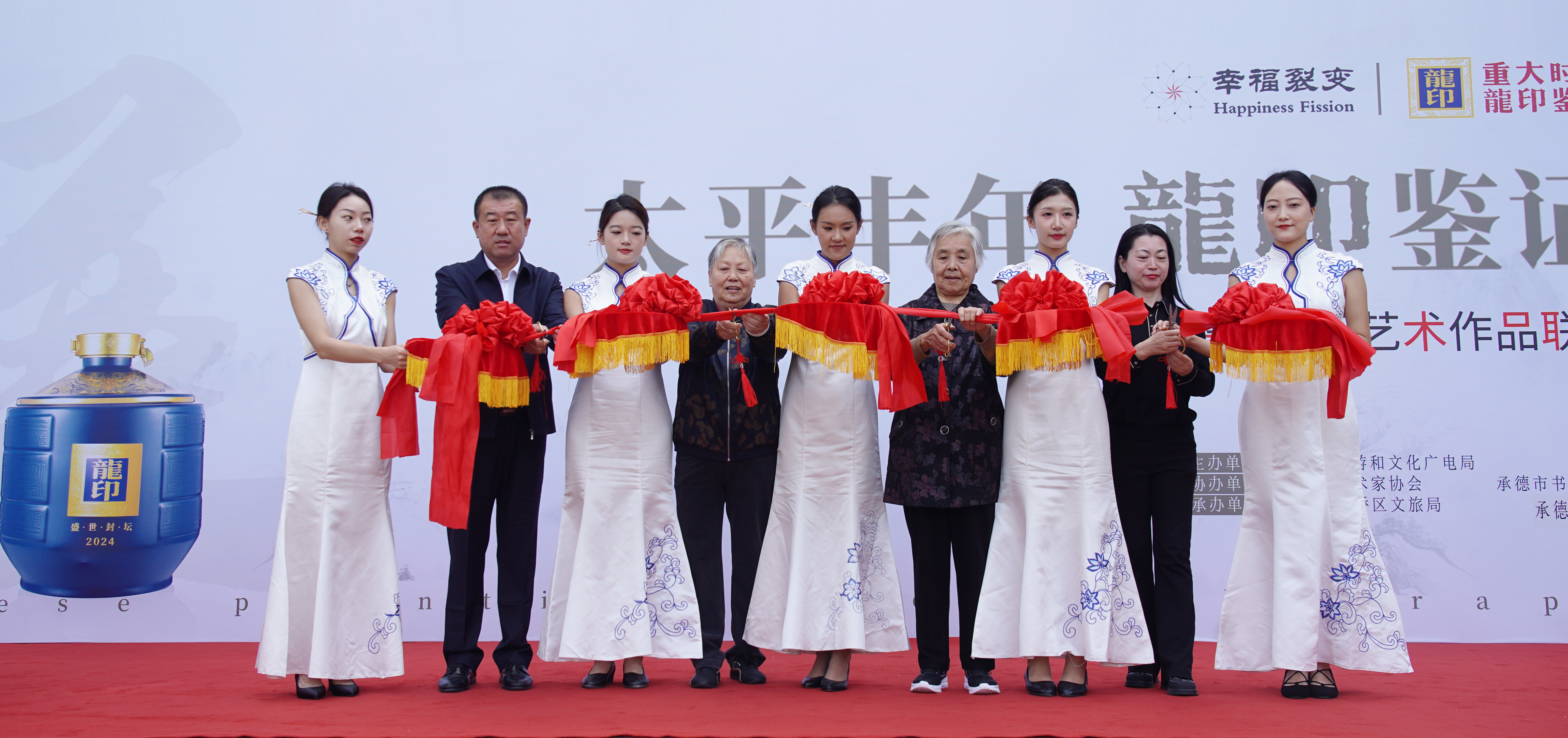 活動(dòng)中,由板城酒業(yè)黨委書記、總經(jīng)理張春生,承德縣文化館館長(zhǎng)王志偉,與老一代藝術(shù)家代表王培文、毛景蘭,一同登臺(tái),共同為“幸福裂變書畫藝術(shù)作品聯(lián)展活動(dòng)”剪彩。