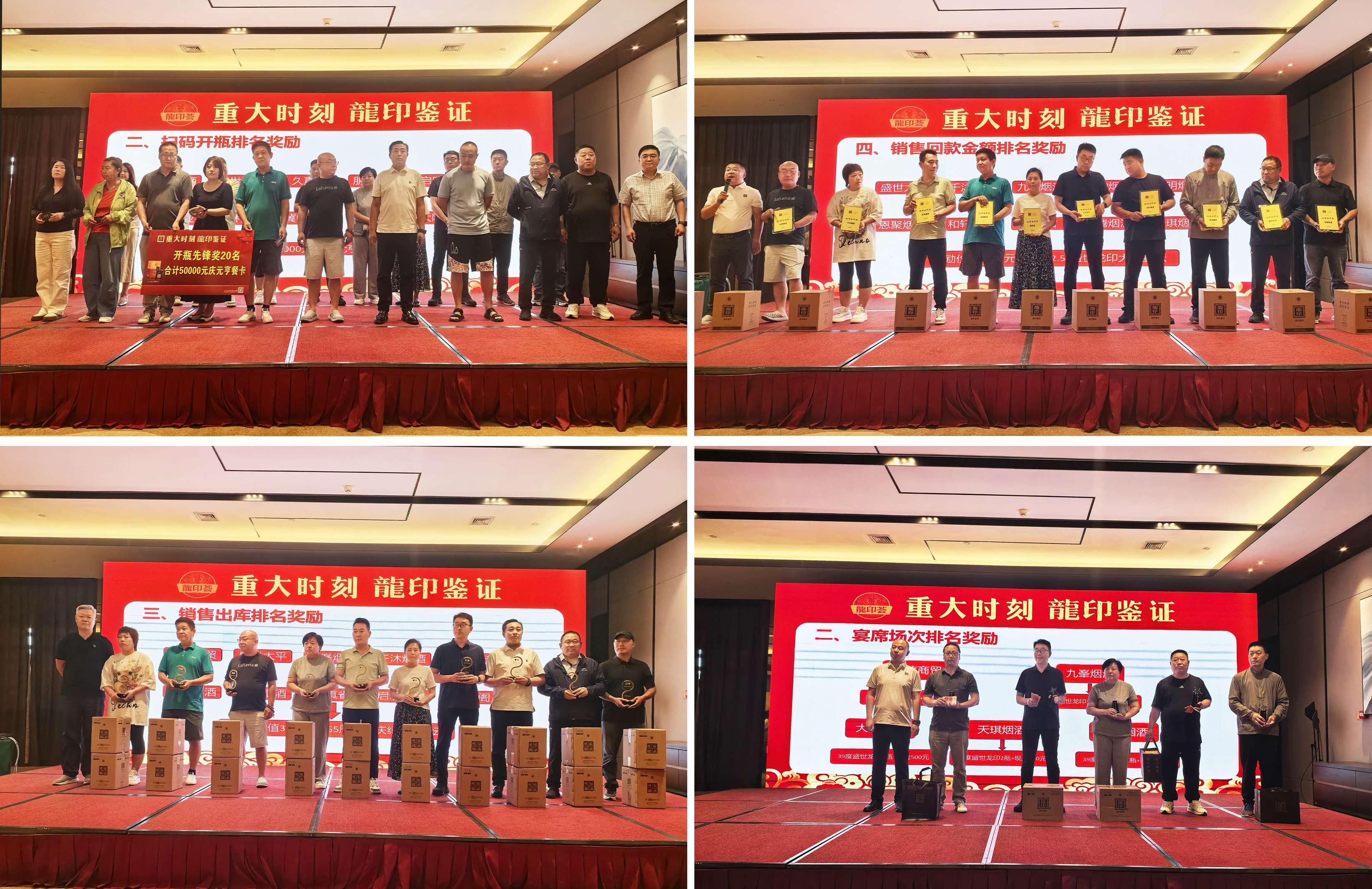 為感謝經(jīng)銷商伙伴長久以來的支持和貢獻(xiàn),活動(dòng)現(xiàn)場還設(shè)置了頒發(fā)環(huán)節(jié),石家莊戰(zhàn)區(qū)龍印部銷售總監(jiān)孫坤申、恒潤德酒類品牌管理有限公司董事長潘雁群、石家莊戰(zhàn)區(qū)龍印部區(qū)域經(jīng)理徐立國、恒潤德酒類品牌管理有限公司龍印事業(yè)部經(jīng)理張?jiān)謩e為開瓶率、履約、回款、宴席做出突出貢獻(xiàn)的終端客戶進(jìn)行頒獎(jiǎng)。