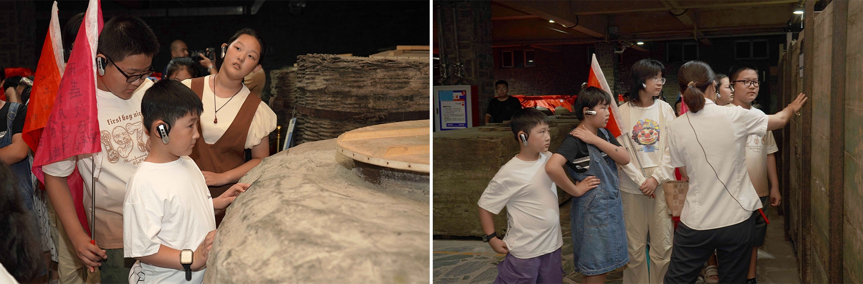 研學(xué)首站來到彌漫著酒曲氣息的慶元亨酒坊,孩子們近距離觀察窖池群落,聆聽“國家級(jí)非物質(zhì)文化遺產(chǎn)老五甑釀酒技藝”的釀酒原理。在恒溫恒濕的乾元酒窖,近距離觀察探索酒海、酒簍、陶壇交替儲(chǔ)存的奧秘,他們化身小小觀察員,分組協(xié)作,細(xì)致追蹤,在實(shí)踐記錄中深刻領(lǐng)悟糧食的珍貴與匠心。